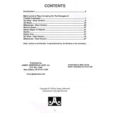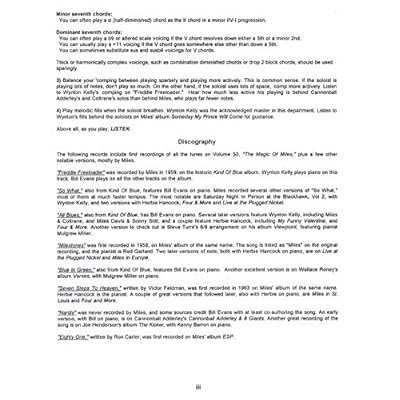 Incredible professional comping over the changes of landmark Miles Davis compositions by a noted master, including: So What (slow), So What (fast), All Blues, Blue In Green, Nardis, Eighty One, Freddie Freeloader, and more!!Why you should consider this and other Aebersold piano voicing transcription books: Ever listen to a great jazz pianist and wonder 'whats he doing there?' Now youll know! Here, as never before, is an opportunity to see REAL jazz piano voicings and comping over REAL songs in REAL live musical settings. These historic books contain NOTE-FOR-NOTE transcriptions, exactly as recorded, of the exciting piano accompaniment from the World Famous Aebersold Play-A-Long series. Not just for pianists, there are many ways for ALL MUSICIANS to use these wonderful musical tools:Pianists: First, listen closely to the pianist on the respective Play-A-Long recording (sold separately). Next, reading from the book, play along with him, imitating his style. Finally, TURN HIM OFF (using the special stereo separation on all of our CDs) and play along by yourself with the bass and drums. With the techniques learned, youll soon be improvising your own accompaniment!Non-Pianists: Horn players, arrangers and vocalists can use these books like dictionaries to look up favorite voicings theyve heard on a particular Play-A-Long track. Written clearly for two hands, even the most novice pianist can play many sections of these books.Teachers/Educators: Give your combo piano students instant jazz voicings and harmonies over a variety of Standards and styles. As personal tools, they will enhance your own understanding of voicings and voice movement and provide you with better skills for accompanying your students.
